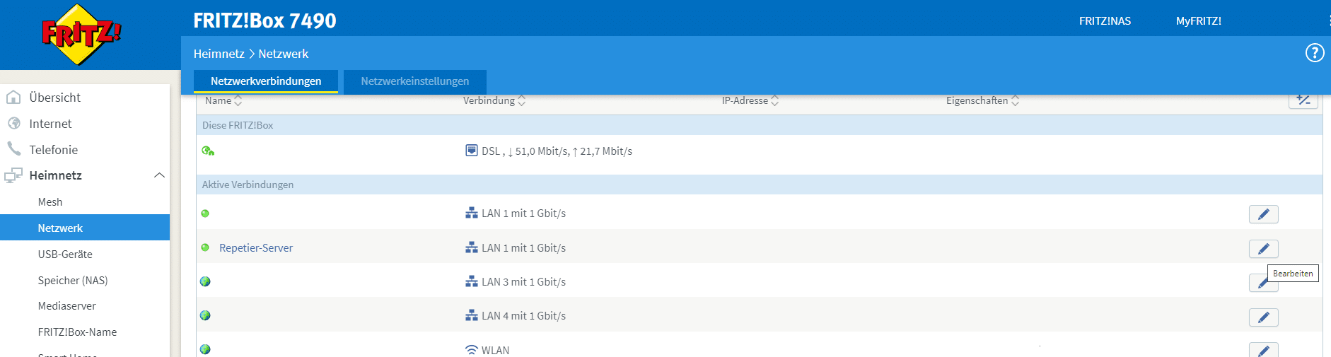 Suche hier nach dem gewünschten Gerät, welches dazu mindestens einmal schon mit der Fritz!Box verbunden gewesen sein muss. Klicke anschließend auf das “Stift”-Symbol rechts um das Gerät zu bearbeiten.
